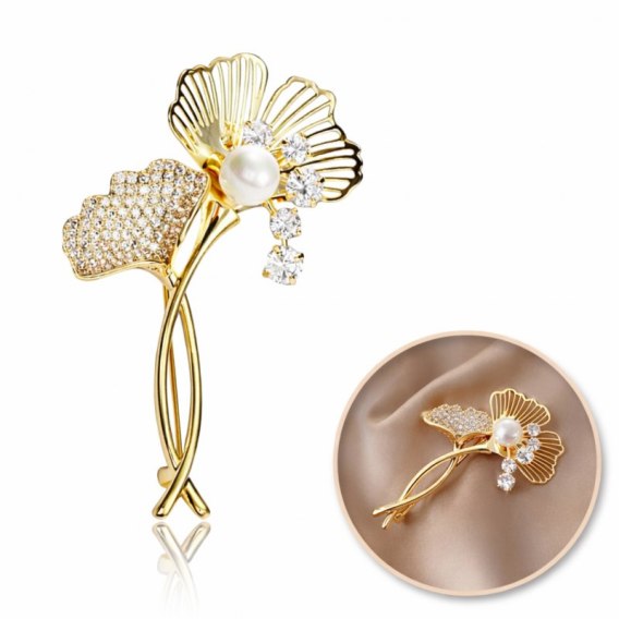 Broszka ozdobna - miłorząb z cyrkoniami i perłą BZ215
