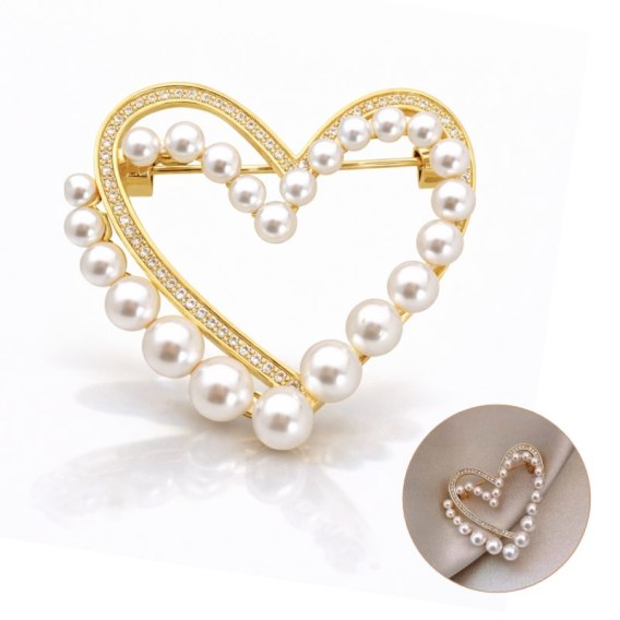 Broszka ozdobna - podwójne złote Serce z cyrkoniami i perłami BZ225