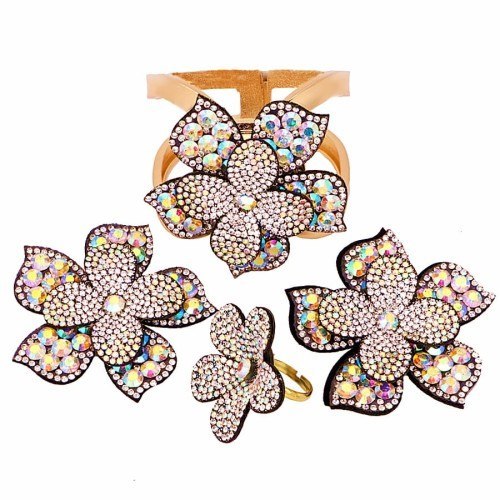 Efektowny, elegancki komplet składający się trzech elementów: Bransoletka średnica 6,7 cm , ozdoba 6.2 na 6.2 cm. Klipsy 6.2 na 6.2 cm. Pierścionek rozmiar uniwersalny, ozdoba wymiary 4 na 4 cm.  Warstwa złota naniesiona w metodzie - PVD- napylanie próżniowe jonami tytanu, czy też azotkiem tytanu jest nowoczesną metodą nanoszenia powłok o bardzo dużej trwałości. * Pokryte jest w całości 4 - 8 mikronową warstwą 14K, 18K i 24K złota. * Warstwa złocenia pokryta jest lakierem jubilerskim, który zabezpiecza powłokę złota przed ścieraniem i nadaje wspaniały połysk * Biżuteria wykonana ze stali szlachetnej-należy do grupy stali o strukturze austenitycznej ( podobna chirurgiczna 316 L) : - jest hipoalergiczna i nie uczula, ponieważ nie emituje związków niklu do organizmu - nie koroduje, nie odbarwia się i długo cieszy swoim blaskiem - ścieralność uzależniona od noszenia i od pH ciała - nie wymaga specjalnej konserwacji jak biżuteria ze srebra, czy złota Ze względu na różne ustawienia monitorów oraz różną jakość wyświetlaczy zastosowanych w urządzeniach mobilnych, kolory przedstawione na zdjęciach mogą nieznacznie różnić się od rzeczywistych. Dokładamy wszelkich starań, aby na stronie Sklepu przedstawiać tylko realne zdjęcia produktów, jak najbardziej zbliżone do rzeczywistości.