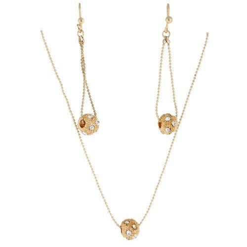 Komplet w kolorze złotym, łańcuszek i kolczyki z kulkami ozdobionymi cyrkoniami.   * Warstwa złota naniesiona w metodzie electroplated * Pokryte jest w całości 4 - 8 mikronową warstwą 14K, 18K i 24K złota * Warstwa złocenia pokryta jest lakierem jubilerskim, który zabezpiecza powłokę złota przed    ścieraniem i nadaje wspaniały połysk * Biżuteria wykonana ze stali szlachetnej-należy do grupy stali o strukturze austenitycznej     ( podobna chirurgiczna 316 L) : - jest hipoalergiczna i nie uczula, ponieważ nie emituje związków niklu do organizmu - nie koroduje, nie odbarwia się i długo cieszy swoim blaskiem - ścieralność uzależniona od noszenia i od pH ciała - nie wymaga specjalnej konserwacji jak biżuteria ze srebra, czy złota
