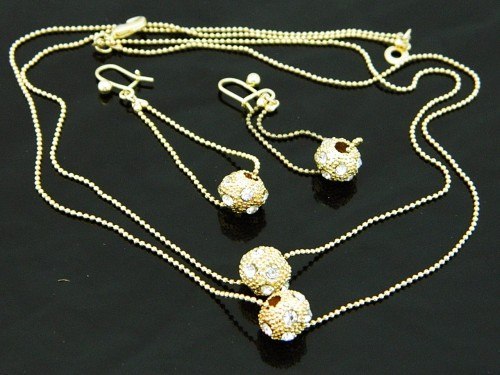 Komplet w kolorze złotym, kulki ozdobione cyrkoniami.* Warstwa złota naniesiona w metodzie electroplated * Pokryte jest w całości 4 - 8 mikronową warstwą 14K, 18K i 24K złota * Warstwa złocenia pokryta jest lakierem jubilerskim, który zabezpiecza powłokę złota przed ścieraniem i nadaje wspaniały połysk * Biżuteria wykonana ze stali szlachetnej-należy do grupy stali o strukturze austenitycznej   ( podobna chirurgiczna 316 L) : - jest hipoalergiczna i nie uczula, ponieważ nie emituje związków niklu do organizmu - nie koroduje, nie odbarwia się i długo cieszy swoim blaskiem - ścieralność uzależniona od noszenia i od pH ciała - nie wymaga specjalnej konserwacji jak biżuteria ze srebra, czy złota
