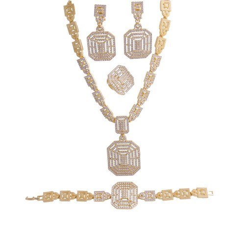 Komplet pozłacany, kolia ozdobna, cyrkonie, wiszący medalion. Wymiary: kolia ( 18,5 x 1,2 cm, ozdoba 6,0 x 3,5 cm), bransoletka ( 21,0  x 1,2, ozdoba wysokość 3,5 cm. ), kolczyki-klipsy 6,0 x 3,0 cm, pierścionek rozmiar uniwersalny, ozdoba 3,5 x 3,0 cm..   Warstwa złota naniesiona w metodzie - PVD- napylanie próżniowe jonami tytanu, czy też azotkiem tytanu jest nowoczesną metodą nanoszenia powłok o bardzo dużej trwałości. * Pokryte jest w całości 4 - 8 mikronową warstwą 14K, 18K i 24K złota. * Warstwa złocenia pokryta jest lakierem jubilerskim, który zabezpiecza powłokę złota przed ścieraniem i nadaje wspaniały połysk * Biżuteria wykonana ze stali szlachetnej-należy do grupy stali o strukturze austenitycznej ( podobna chirurgiczna 316 L) : - jest hipoalergiczna i nie uczula, ponieważ nie emituje związków niklu do organizmu - nie koroduje, nie odbarwia się i długo cieszy swoim blaskiem - ścieralność uzależniona od noszenia i od pH ciała - nie wymaga specjalnej konserwacji jak biżuteria ze srebra, czy złota Ze względu na różne ustawienia monitorów oraz różną jakość wyświetlaczy zastosowanych w urządzeniach mobilnych, kolory przedstawione na zdjęciach mogą nieznacznie różnić się od rzeczywistych. Dokładamy wszelkich starań, aby na stronie Sklepu przedstawiać tylko realne zdjęcia produktów, jak najbardziej zbliżone do rzeczywistości.