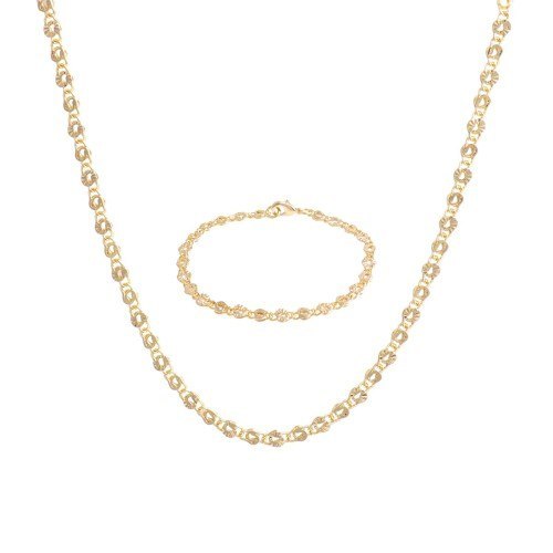 Komplet pozłacany, płaskie , ozdobne, szlifowane ogniwa.  Wymiary: łańcuszek ( 22,0 x 0,4 cm), bransoletka ( 19,5 x 0,4 ).   Warstwa złota naniesiona w metodzie - PVD- napylanie próżniowe jonami tytanu, czy też azotkiem tytanu jest nowoczesną metodą nanoszenia powłok o bardzo dużej trwałości. * Pokryte jest w całości 4 - 8 mikronową warstwą 14K, 18K i 24K złota. * Warstwa złocenia pokryta jest lakierem jubilerskim, który zabezpiecza powłokę złota przed ścieraniem i nadaje wspaniały połysk * Biżuteria wykonana ze stali szlachetnej-należy do grupy stali o strukturze austenitycznej ( podobna chirurgiczna 316 L) : - jest hipoalergiczna i nie uczula, ponieważ nie emituje związków niklu do organizmu - nie koroduje, nie odbarwia się i długo cieszy swoim blaskiem - ścieralność uzależniona od noszenia i od pH ciała - nie wymaga specjalnej konserwacji jak biżuteria ze srebra, czy złota Ze względu na różne ustawienia monitorów oraz różną jakość wyświetlaczy zastosowanych w urządzeniach mobilnych, kolory przedstawione na zdjęciach mogą nieznacznie różnić się od rzeczywistych. Dokładamy wszelkich starań, aby na stronie Sklepu przedstawiać tylko realne zdjęcia produktów, jak najbardziej zbliżone do rzeczywistości.