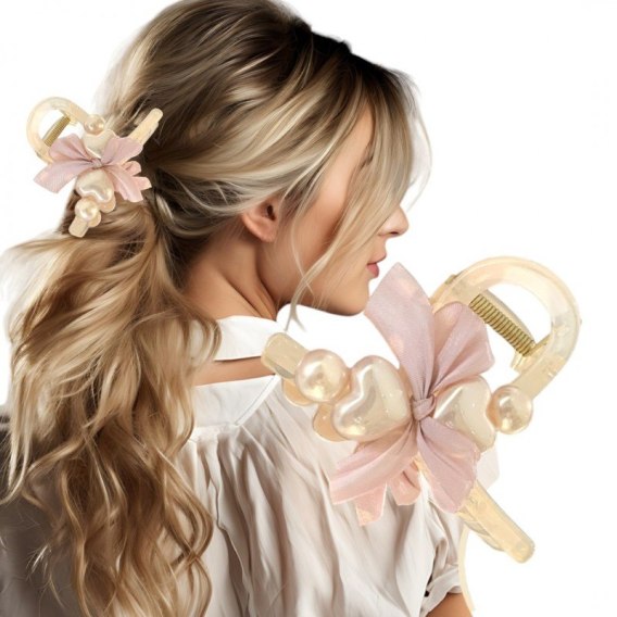 Spinka klamra do włosów XL kokarda i perłowe SERCA róż 8x6cm SP372