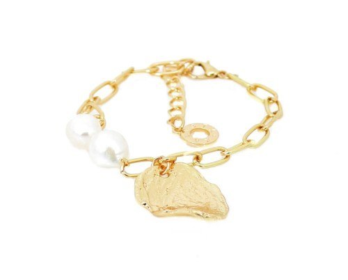 Efektowna bransoletka z ozdobą typu kamień  i z perłami. Długość  22 cm, szerokość łańcuszka 0,5 cm   Warstwa złota naniesiona w metodzie - PVD- napylanie próżniowe jonami tytanu, czy też azotkiem tytanu jest nowoczesną metodą nanoszenia powłok o bardzo dużej trwałości. * Pokryte jest w całości 4 - 8 mikronową warstwą 14K, 18K i 24K złota. * Warstwa złocenia pokryta jest lakierem jubilerskim, który zabezpiecza powłokę złota przed ścieraniem i nadaje wspaniały połysk * Biżuteria wykonana ze stali szlachetnej-należy do grupy stali o strukturze austenitycznej ( podobna chirurgiczna 316 L) : - jest hipoalergiczna i nie uczula, ponieważ nie emituje związków niklu do organizmu - nie koroduje, nie odbarwia się i długo cieszy swoim blaskiem - ścieralność uzależniona od noszenia i od pH ciała - nie wymaga specjalnej konserwacji jak biżuteria ze srebra, czy złota Ze względu na różne ustawienia monitorów oraz różną jakość wyświetlaczy zastosowanych w urządzeniach mobilnych, kolory przedstawione na zdjęciach mogą nieznacznie różnić się od rzeczywistych. Dokładamy wszelkich starań, aby na stronie Sklepu przedstawiać tylko realne zdjęcia produktów, jak najbardziej zbliżone do rzeczywistości.