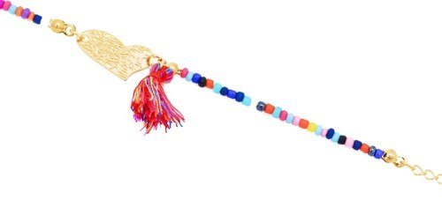 Bransoletka z kolorowymi koralikami z sercem i ozdobnymi frędzlami Długość maksymalna 20 cm, szerokość 0,3 cm, szerokość ozdoby 2 cm, frędzle długość 3 cm, przedłużenie 6 cm. Warstwa złota naniesiona w metodzie electroplated * Pokryte jest w całości 4 - 8 mikronową warstwą 14K, 18K i 24K złota * Warstwa złocenia pokryta jest lakierem jubilerskim, który zabezpiecza powłokę złota przed ścieraniem i nadaje wspaniały połysk * Biżuteria wykonana ze stali szlachetnej-należy do grupy stali o strukturze austenitycznej ( podobna chirurgiczna 316 L) : - jest hipoalergiczna i nie uczula, ponieważ nie emituje związków niklu do organizmu - nie koroduje, nie odbarwia się i długo cieszy swoim blaskiem - ścieralność uzależniona od noszenia i od pH ciała - nie wymaga specjalnej konserwacji jak biżuteria ze srebra, czy złota Ze względu na różne ustawienia monitorów oraz różną jakość wyświetlaczy zastosowanych w urządzeniach mobilnych, kolory przedstawione na zdjęciach mogą nieznacznie różnić się od rzeczywistych. Dokładamy wszelkich starań, aby na stronie Sklepu przedstawiać tylko realne zdjęcia produktów, jak najbardziej zbliżone do rzeczywistości.