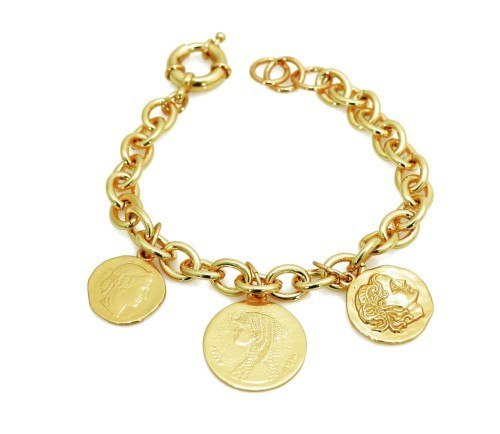 Bransoletka z monetkami na grubym łańcuszku. Stal szlachetna pozłacana. Gwarancja pozłocenia i jakości. Warstwa złota naniesiona w metodzie - PVD- napylanie próżniowe jonami tytanu, czy też azotkiem tytanu jest nowoczesną metodą nanoszenia powłok o bardzo dużej trwałości. * Pokryte jest w całości 4 - 8 mikronową warstwą 14K, 18K i 24K złota. * Warstwa złocenia pokryta jest lakierem jubilerskim, który zabezpiecza powłokę złota przed ścieraniem i nadaje wspaniały połysk * Biżuteria wykonana ze stali szlachetnej-należy do grupy stali o strukturze austenitycznej ( podobna chirurgiczna 316 L) : - jest hipoalergiczna i nie uczula, ponieważ nie emituje związków niklu do organizmu - nie koroduje, nie odbarwia się i długo cieszy swoim blaskiem - ścieralność uzależniona od noszenia i od pH ciała - nie wymaga specjalnej konserwacji jak biżuteria ze srebra, czy złota Ze względu na różne ustawienia monitorów oraz różną jakość wyświetlaczy zastosowanych w urządzeniach mobilnych, kolory przedstawione na zdjęciach mogą nieznacznie różnić się od rzeczywistych. Dokładamy wszelkich starań, aby na stronie Sklepu przedstawiać tylko realne zdjęcia produktów, jak najbardziej zbliżone do rzeczywistości.