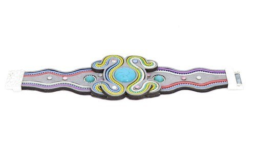 Z tą bransoletką zostaniesz zauważona!!! Etniczna bransoletka z eko skóry z cyrkoniami. Eko skórka w kolorze niebieskim z różnokolorowymi cyrkoniami i dodatkowymi zdobieniami. Wygodne zapięcie na magnez. HIT tego lata !!!  Długość 19 cm, szerokość 5 cm.     Warstwa złota naniesiona w metodzie electroplated * Pokryte jest w całości 4 - 8 mikronową warstwą 14K, 18K i 24K złota * Warstwa złocenia pokryta jest lakierem jubilerskim, który zabezpiecza powłokę złota przed ścieraniem i nadaje wspaniały połysk * Biżuteria wykonana ze stali szlachetnej-należy do grupy stali o strukturze austenitycznej ( podobna chirurgiczna 316 L) : - jest hipoalergiczna i nie uczula, ponieważ nie emituje związków niklu do organizmu - nie koroduje, nie odbarwia się i długo cieszy swoim blaskiem - ścieralność uzależniona od noszenia i od pH ciała - nie wymaga specjalnej konserwacji jak biżuteria ze srebra, czy złota Ze względu na różne ustawienia monitorów oraz różną jakość wyświetlaczy zastosowanych w urządzeniach mobilnych, kolory przedstawione na zdjęciach mogą nieznacznie różnić się od rzeczywistych. Dokładamy wszelkich starań, aby na stronie Sklepu przedstawiać tylko realne zdjęcia produktów, jak najbardziej zbliżone do rzeczywistości.