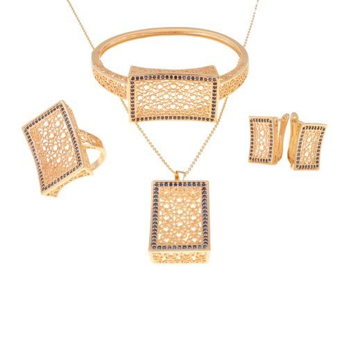 Komplet pozłacany, bardzo ozdobny. Duży ażurowy prostokąt z kolorowymi cyrkoniami. W komplecie łańcuszek, sztywna bransoletka, kolczyki oraz pierścionek.  Stal szlachetna pozłacana. Gwarancja pozłocenia i jakości. Warstwa złota naniesiona w metodzie - PVD- napylanie próżniowe jonami tytanu, czy też azotkiem tytanu jest nowoczesną metodą nanoszenia powłok o bardzo dużej trwałości. * Pokryte jest w całości 4 - 8 mikronową warstwą 14K, 18K i 24K złota. * Warstwa złocenia pokryta jest lakierem jubilerskim, który zabezpiecza powłokę złota przed ścieraniem i nadaje wspaniały połysk * Biżuteria wykonana ze stali szlachetnej-należy do grupy stali o strukturze austenitycznej ( podobna chirurgiczna 316 L) : - jest hipoalergiczna i nie uczula, ponieważ nie emituje związków niklu do organizmu - nie koroduje, nie odbarwia się i długo cieszy swoim blaskiem - ścieralność uzależniona od noszenia i od pH ciała - nie wymaga specjalnej konserwacji jak biżuteria ze srebra, czy złota Ze względu na różne ustawienia monitorów oraz różną jakość wyświetlaczy zastosowanych w urządzeniach mobilnych, kolory przedstawione na zdjęciach mogą nieznacznie różnić się od rzeczywistych. Dokładamy wszelkich starań, aby na stronie Sklepu przedstawiać tylko realne zdjęcia produktów, jak najbardziej zbliżone do rzeczywistości.