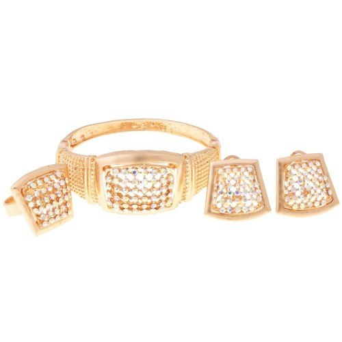 Komplet pozłacany, bardzo ozdobny. Duży ozdobny wysadzany pastelowymi kolorami. W komplecie sztywna bransoleta, kolczyki oraz pierścionek. pierścionek 2,0 x 2,0 cm obrączka regulowana, kolczyki 2,0 cmx 2,0 cm. , bransoletka średnica 6,0 cm    Stal szlachetna pozłacana. Gwarancja pozłocenia i jakości. Warstwa złota naniesiona w metodzie - PVD- napylanie próżniowe jonami tytanu, czy też azotkiem tytanu jest nowoczesną metodą nanoszenia powłok o bardzo dużej trwałości. * Pokryte jest w całości 4 - 8 mikronową warstwą 14K, 18K i 24K złota. * Warstwa złocenia pokryta jest lakierem jubilerskim, który zabezpiecza powłokę złota przed ścieraniem i nadaje wspaniały połysk * Biżuteria wykonana ze stali szlachetnej-należy do grupy stali o strukturze austenitycznej ( podobna chirurgiczna 316 L) : - jest hipoalergiczna i nie uczula, ponieważ nie emituje związków niklu do organizmu - nie koroduje, nie odbarwia się i długo cieszy swoim blaskiem - ścieralność uzależniona od noszenia i od pH ciała - nie wymaga specjalnej konserwacji jak biżuteria ze srebra, czy złota Ze względu na różne ustawienia monitorów oraz różną jakość wyświetlaczy zastosowanych w urządzeniach mobilnych, kolory przedstawione na zdjęciach mogą nieznacznie różnić się od rzeczywistych. Dokładamy wszelkich starań, aby na stronie Sklepu przedstawiać tylko realne zdjęcia produktów, jak najbardziej zbliżone do rzeczywistości.