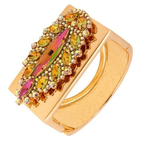 Niezwykle kolorowa bransoletka z kamieniami Wymiary bransoletki średnica 7 cm, szerokość 3,8 cm   Ze względu na różne ustawienia monitorów oraz różną jakość wyświetlaczy zastosowanych w urządzeniach mobilnych, kolory przedstawione na zdjęciach mogą nieznacznie różnić się od rzeczywistych. Dokładamy wszelkich starań, aby na stronie Sklepu przedstawiać tylko realne zdjęcia produktów, jak najbardziej zbliżone do rzeczywistości. Stal szlachetna pozłacana. Gwarancja pozłocenia i jakości. Warstwa złota naniesiona w metodzie - PVD- napylanie próżniowe jonami tytanu, czy też azotkiem tytanu jest nowoczesną metodą nanoszenia powłok o bardzo dużej trwałości. * Pokryte jest w całości 4 - 8 mikronową warstwą 14K, 18K i 24K złota. * Warstwa złocenia pokryta jest lakierem jubilerskim, który zabezpiecza powłokę złota przed ścieraniem i nadaje wspaniały połysk * Biżuteria wykonana ze stali szlachetnej-należy do grupy stali o strukturze austenitycznej ( podobna chirurgiczna 316 L) : - jest hipoalergiczna i nie uczula, ponieważ nie emituje związków niklu do organizmu - nie koroduje, nie odbarwia się i długo cieszy swoim blaskiem - ścieralność uzależniona od noszenia i od pH ciała - nie wymaga specjalnej konserwacji jak biżuteria ze srebra czy złota
