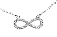 Zawieszka z łańcuszkiem w kolorze srebrnym,  z motywem nieskończoności ozdobiona cyrkoniami. * Warstwa srebra naniesiona w metodzie electroplated * Pokryte jest w całości 4 - 8 mikronową warstwą srebra 925 * Warstwa posrebrzania pokryta jest lakierem jubilerskim który zabezpiecza powłokę srebra    przed ścieraniem i nadaje wspaniały połysk * Biżuteria wykonana ze stali szlachetnej-należy do grupy stali o strukturze austenitycznej    ( podobna chirurgiczna 316 L) : - jest hipoalergiczna i nie uczula, ponieważ nie emituje związków niklu do organizmu - nie koroduje, nie odbarwia się i długo cieszy swoim blaskiem - ścieralność uzależniona od noszenia i od pH ciała - nie wymaga specjalnej konserwacji jak biżuteria ze srebra ,czy złota